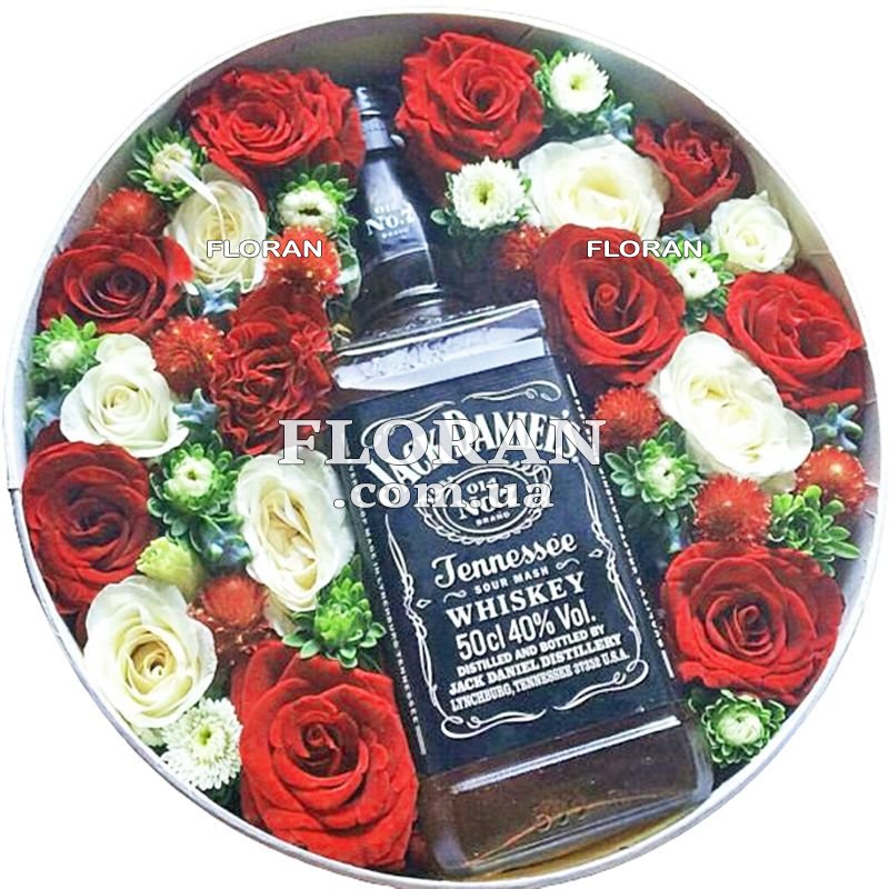 Квіти і віскі - код товару FL-215. Цей набір - ідеальний подарунок для будь-якого чоловіка. У ньому поєднуються квіти та алкоголь у коробці, що робить його універсальним подарунком на будь-яке свято. У складі набору 5 червоних троянд, 6 білих троянд, 4 хризантеми і віскі Jack Daniels об'ємом 0,5 л. Букет із троянд, хризантем і кущових троянд - це прекрасний спосіб висловити свої почуття і побажати щастя та любові. Якщо ви шукаєте чоловічу коробку з віскі, то цей набір ідеально підійде. Квіти червоного і білого кольору чудово поєднуються один з одним і створюють неповторну атмосферу. Набір також може бути прикрашений стрічкою і бантом, щоб зробити його ще більш елегантним. Не пропустіть можливість порадувати своїх близьких цим прекрасним подарунком.