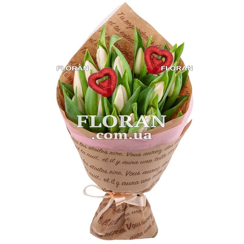 Квіти на День закоханих – код товару FL-585. Букет із 15 білих тюльпанів та двох декоративних сердець - це чудовий вибір для подарунка на День закоханих. Білі тюльпани символізують чистоту та ніжність почуттів, які переживають закохані. Цей букет підкреслить вашу любов і повагу до вашої другої половинки, і говоритиме про вашу щирість і чуттєвість.