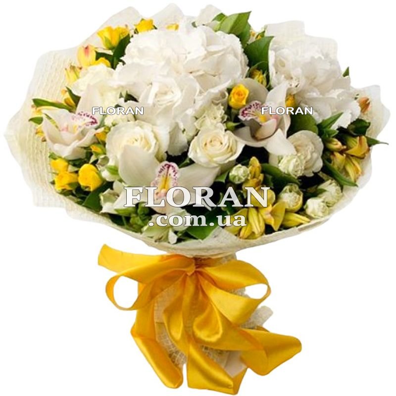 - 2 білі гортензії: гортензії мають великі суцвіття, які створюють враження об'ємності та пишності. Білий колір гортензій символізує чистоту та ніжність.