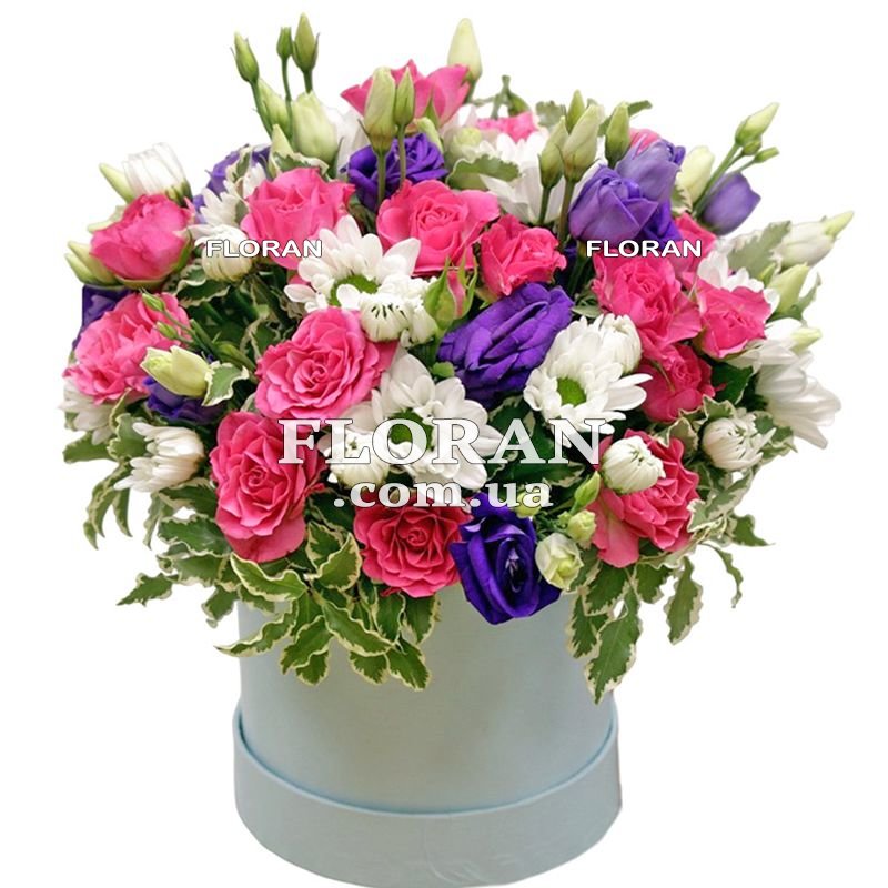 Квіти в коробці - код товару FL-195. Ця яскрава композиція в коробці, створена з 7 кущових троянд, 11 еустом і 7 білих хризантем. Кожна квітка в цьому букеті - справжнє диво природи, яке здатне подарувати радість і посмішку. Хризантема і еустома, що поєднуються з кущовими трояндами, створюють неповторний аромат і ніжність. Соковитий букет у коробці - це прекрасний подарунок для будь-якого випадку. Різнобарвний букет у коробці - це справжній витвір мистецтва, який подарує радість і посмішку. Не пропустіть можливість порадувати своїх близьких і друзів цим прекрасним букетом.
