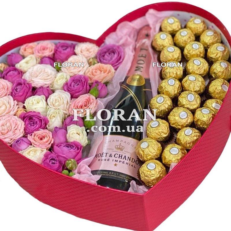 Квіти в коробці з шампанським - код товару FL-214. Цей набір - ідеальний подарунок для тих, хто любить розкіш і вишуканість. Квіти і алкоголь в коробці - що може бути краще? У наборі ви знайдете 7 різнокольорових кущових троянд, 24 цукерки Ferrero Rocher і шампанське Moet & Chandon 0,75 л. Це елітне шампанське, яке підкреслить особливість вашого подарунка.