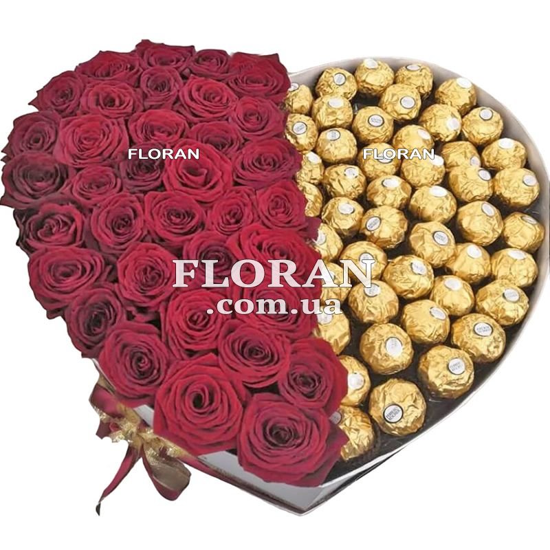 Якщо ви хочете замовити тільки троянди з цукерками, то ми можемо запропонувати вам композицію з 35 троянд і 46 цукерок Ferrero Rocher. Це буде чудовий подарунок для вашої другої половинки або для того, хто любить розкіш і красу.