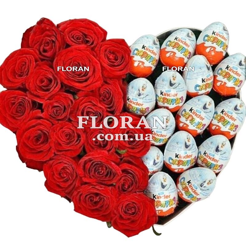 19 червоних троянд, 15 яиц Kinder Сюрприз, коробка