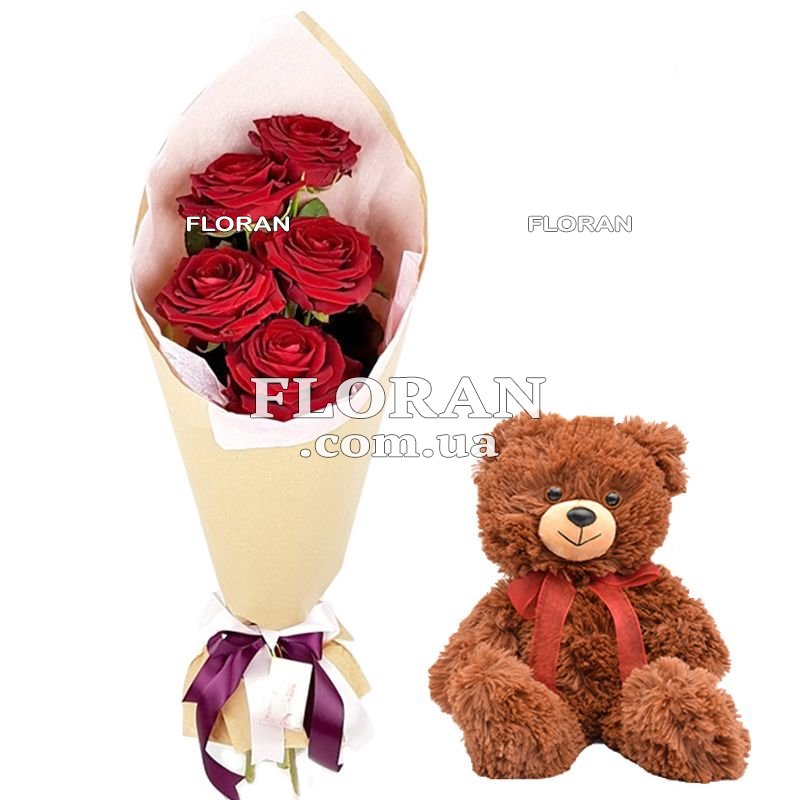 Квіти з ведмедиком - код товару FL-547. Отримати подарунок у вигляді 5 червоних троянд та милого плюшевого ведмедика - це така приємна та зворушлива подія! Червоні троянди завжди були символом любові, пристрасті та романтики, а плюшевий ведмедик додає у подарунок ніжності та тепла. Коричневий колір ведмежа створює затишну атмосферу та приємний настрій. Отримати такий подарунок від близької людини дозволяє відчути її турботу та любов, тому це дарує не лише радість, а й особливе почуття умиротворення. Красиві троянди та плюшевий ведмедик стануть чудовим подарунком на День Народження, День Святого Валентина або просто на знак уваги та кохання.
