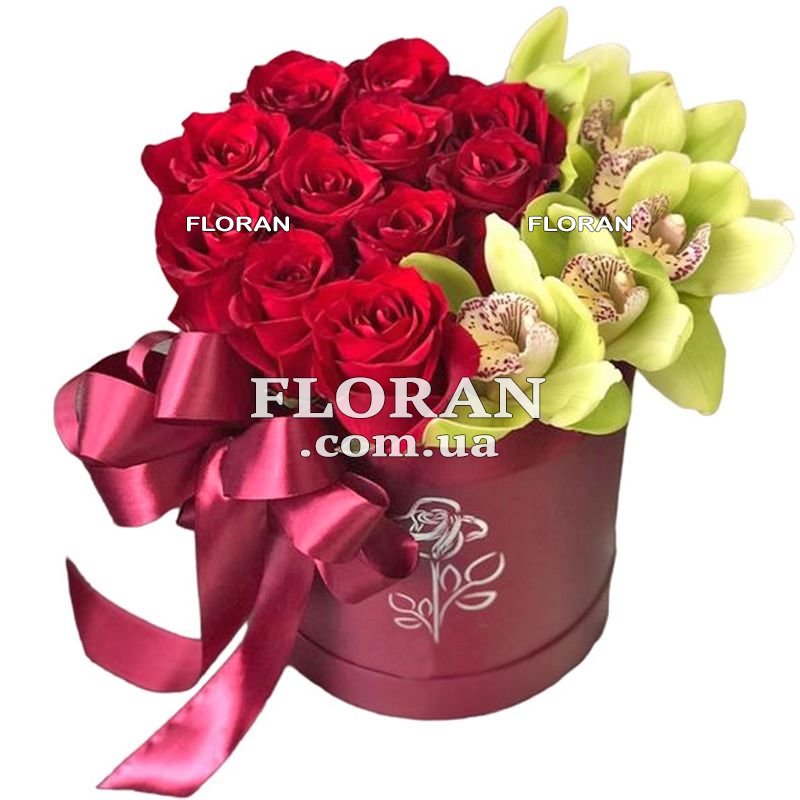 Маленька композиція з квітів у коробці - код товару FL-2990 - універсальний подарунок, який підкреслить ваші почуття та турботу. П'ять зелених орхідей надають таємничість і загадковість букету, а десять червоних троянд символізують пристрасть і глибокі почуття. Даруючи таку коробку, ви подаруєте шматочок природної краси та натхнення. Цей подарунок підходить як для вашої коханої дівчини, так і для брата чи чоловіка. Орхідеї додають витонченості та елегантності, тоді як червоні троянди виражають ваше щире кохання та стійкість почуттів. У цій коробці кожна квітка - як окремий розділ чудової історії, яку ви пишете разом.