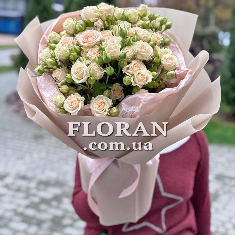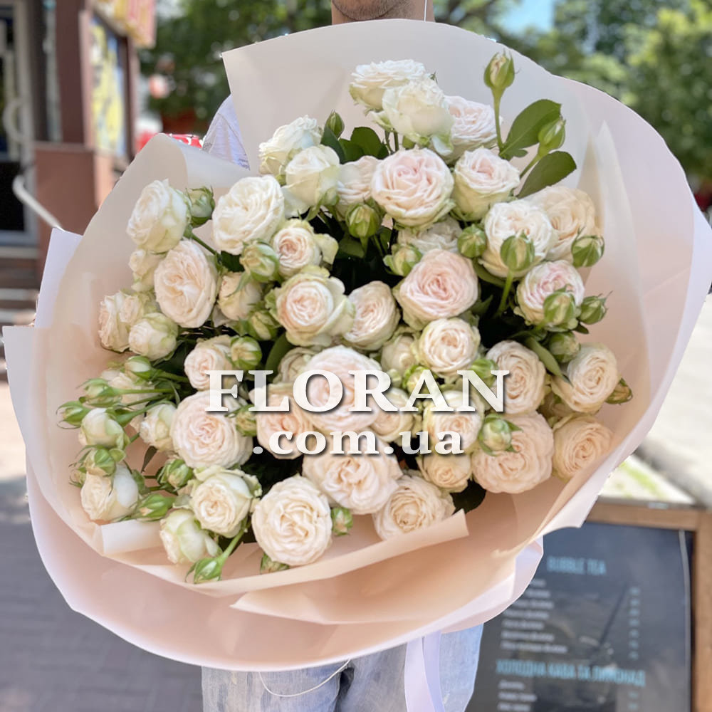 Маленькі кущові троянди - код товару FL-1384. Представляю вам прекрасний букет з 11 маленьких кущових кремових троянд. Ці ніжні і витончені квіти мають свою особливу чарівність і створять атмосферу теплоти і ніжності. Маленькі кущові троянди захоплюють своєю маленькою, але вражаючою красою. Їхні компактні бутони і прекрасна форма створюють чудове видовище, додаючи нотку вишуканості та елегантності в будь-який простір. Букет з 11 кремових маленьких кущових троянд ідеально підходить як подарунок для різних особливих подій та свят. Він може стати чудовим презентом для дня народження, ювілею, весілля або просто для того, щоб висловити свою ніжність та любов до особливої людини. Додатково прикрашений стрічкою, цей букет набуває ще більшої вишуканості та завершеності. Стрічка додає нотку романтики та робить подарунок ще більш привабливим та стильним. Нехай ці 11 кремових маленьких кущових троянд принесуть у ваше життя красу, свіжість та натхнення. Нехай вони стануть символом вашої турботи, ніжності та особливої уваги, яку ви відчуваєте до людини, якій адресовано цей чудовий букет.