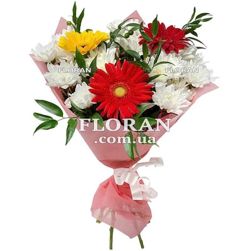 3 гербери, 4 білі хризантеми, зелень, упаковка