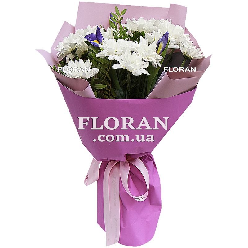Маленький букетик з хризантемами та ірисами - код товару FL-2522 - це ніжний і компактний подарунок, що ідеально підходить для подяки, не перевантажуючи одержувача. Цей маленький букет може бути чудовим способом сказати спасибі і порадувати тих, хто надав допомогу або заслуговує на вдячність. Білі хризантеми символізують чистоту та світло. Вони приносять у подарунок свіжість та позитивні емоції. Іриси додають букету нотку вишуканості та поваги. Їхня ніжність і краса роблять букет ще більш особливим. Упаковка для букета допомагає зберегти його свіжість та надати подарунку завершеного вигляду. Це додає додаткової елегантності та оформляє ваш подарунок якнайкраще. Такий маленький букет підходить для різних випадків подяки. Ви можете відправити його секретареві за його старанність і роботу, подякувати співробітникові компанії за його внесок або висловити вдячність бабусі за її турботу та підтримку. Цей маленький подарунок буде ніжним символом вашої подяки та поваги. Наш магазин гарантує надійну доставку букетика в потрібний час та місце. Ми дбаємо про те, щоб ваш подарунок досяг отримувача у найкращому стані, приносячи радість та задоволення.