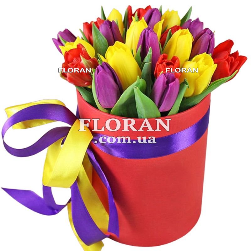 Мікс тюльпанів у коробці - код товару FL-2850 - У затишному куточку будинку розквітає мікс тюльпанів, представлених у вишуканій коробці. Цей подарунок наче крапля весняного дощу, що пробуджує життя і наповнює простір неймовірною красою. У коробці 21 тюльпан різнокольорових відтінків, створюючи яскраве та надихаюче поєднання. Цей букет є справжнім втіленням різноманітності та краси природи. Різнокольорові тюльпани, наче крихітні барвисті картини, уособлюють у собі веселку почуттів та емоцій. Кожна квітка, як нота в мелодії, надає композиції свого особливого шарму і характеру. Цей букет стає символом ніжності та веселощів. Він як послання кохання, позитиву та тепла. Подарувавши такий мікс тюльпанів, ви створюєте атмосферу веселощів та радості, нагадуючи про важливість кожного моменту. Кожен тюльпан - як унікальна гармонія у цій весняній симфонії. Ця коробка з тюльпанами не лише прикрашає простір, а й приносить у нього свіжість та світло. Будь то день народження, свято чи просто бажання подарувати радість, мікс тюльпанів у коробці - чудовий спосіб висловити свої почуття та створити навколо себе весняну атмосферу.