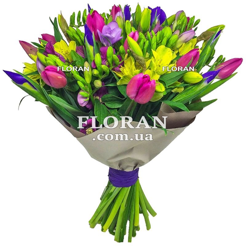 Міксовий букет з тюльпанами – код товару FL-2460 – це справжній калейдоскоп квітів та емоцій. У цьому букеті поєднуються різноманітні відтінки та види кольорів, створюючи дивовижне поєднання. 10 рожевих тюльпанів вносять романтичні нотки в композицію, наголошуючи на ніжності та чуттєвості. 5 жовтих альстромерій надають яскравого та сонячного акценту, символізуючи радість та дружелюбність. 7 ірисів додають вишуканості та загадковості, а 5 фрезій привносять легкий та хвилюючий аромат. Отримавши такий міксовий букет, людина відчує себе оточеною різноманітністю фарб та емоцій. Цей букет подарує радість та захоплення, підкреслить глибокі почуття та створить атмосферу тепла та гармонії. Це ідеальний вибір для особливих випадків, коли хочеться зробити щось унікальне та незабутнє.