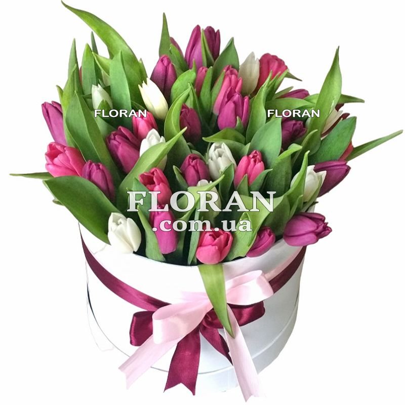 35 білих, рожевих та фіолетових тюльпанів, коробка