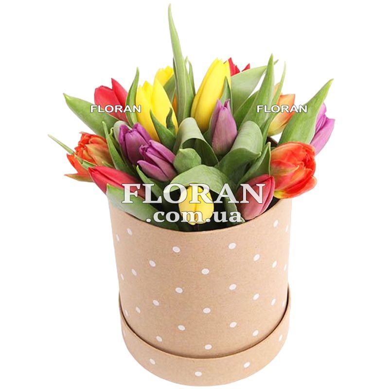 Невелика коробочка тюльпанів - код товару FL-2851 - 17 різнокольорових тюльпанів у витонченій коробочці. Цей маленький, але яскравий букет стане чудовим проявом вашої уваги та ніжності до близької людини. Своїми фарбами цей букет тюльпанів нагадує справжній весняний калейдоскоп. Яскраві відтінки та ніжні пелюстки створюють атмосферу радості та тепла. Кожен бутон, наче маленьке диво, готовий розцвісти, приносячи з собою краплю свіжості та затишку. Незважаючи на свою компактність, ця коробочка тюльпанів здатна багато сказати. Вона підходить для різних випадків: будь то привітання з днем народження, прояв уваги у звичайний день або ніжний знак захоплення. Використовуючи нашу службу доставки, ви можете зробити цей милий букет подарунком, який прийде прямо у потрібне місце у потрібний момент. Будь то будинок, офіс або місце, де ваша близька людина проводить найбільше часу - цей живий маленький шедевр зможе створити тепле враження, що запам'ятовується.