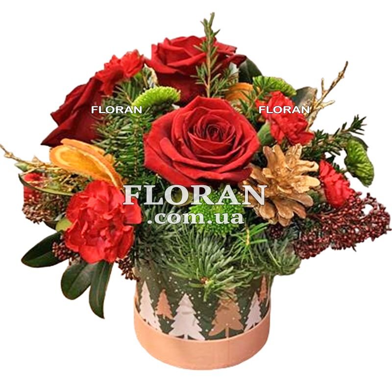 Невелика коробочка з квітами та ялиною - код товару FL-2166 - це чудовий спосіб порадувати близьких напередодні новорічних свят. Адже саме такі невеликі, але уважні подарунки можуть перенести частинку свята у серця людей і зробити їхній настрій святковим. Для дитини така композиція буде дивовижним сюрпризом, адже в ній є яскраві квіти та новорічні гвоздики, а також ароматні гілки ялини чи сосни, які нагадують про наближення найчарівнішої пори року. Для дівчини такий ніжний подарунок буде проявом вашої турботи та уваги, а для мами чи бабусі – вираженням теплих почуттів та знаком уваги. Навіть сестра і хрещена, отримавши таку композицію, відчують вашу подяку та любов. І не забудьте, що ми надаємо послугу доставки наших новорічних композицій, що робить процес подарування ще зручнішим. Ви можете замовити цю маленьку коробочку з квітами та ялиною та відправити її близьким у будь-якому куточку міста, щоб подарувати їм частинку новорічної чарівної атмосфери.