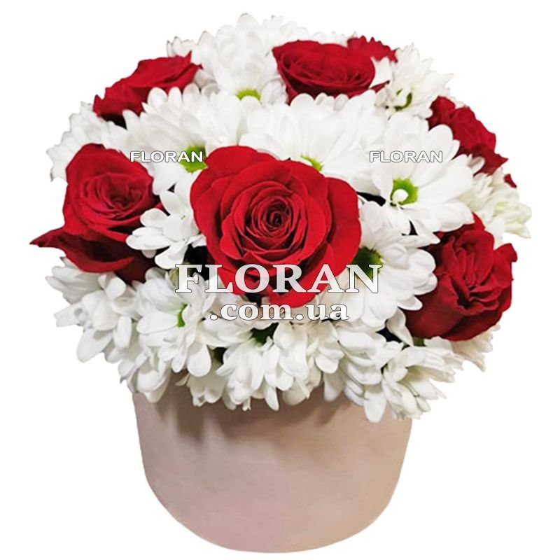Невеликий букет квітів у коробці - код товару FL-2976 - це ніжна та вишукана композиція, яка переповнює почуттями та теплом. У цій коробці розташовані 7 червоних троянд та 6 білих хризантем, створюючи гармонію та вишукану красу. Червоні троянди є символом пристрасті та кохання, тоді як білі хризантеми надають композиції чистоти та свіжості. Цей букет ідеально підходить як вираження ваших щирих почуттів, чи то вітання, освідчення в коханні чи просто бажання подарувати радість. Коробка, в якій представлений букет, надає композиції особливого шарму і робить її зручною для пересування. Таким чином, цей маленький букет стане чудовим сюрпризом, даруючи тепло та умиротворення. Наші кур'єри з радістю доставлять цей букет квітів у коробці за вказаною адресою, щоб подарувати яскраві моменти щастя вашим близьким. Наголосіть на важливості цих моментів з цією чудовою композицією.