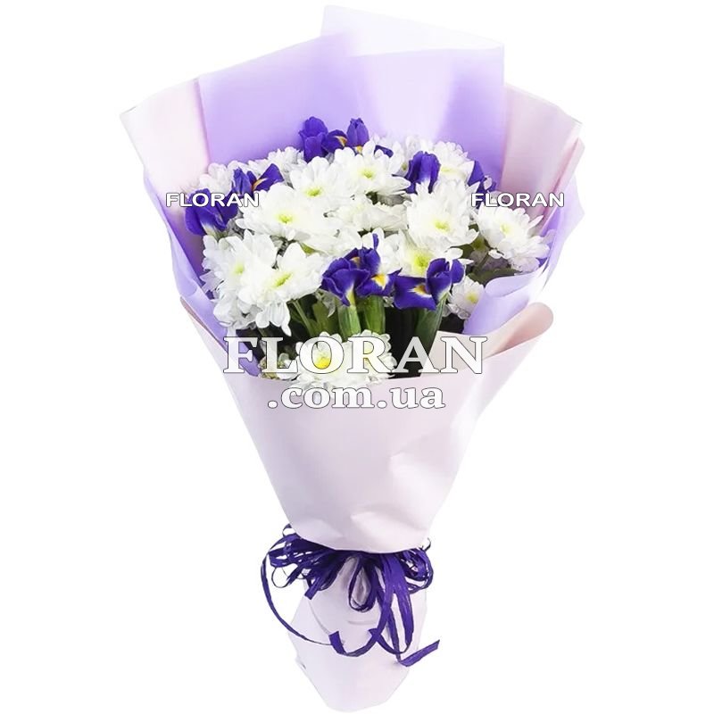 Невеликий букет з ірисами та хризантемами - код товару FL-2521 - це витончений та ніжний подарунок, який підходить для різних випадків. Невеликий розмір цього букета робить його ідеальним варіантом для знаку уваги та ніжності. Білі хризантеми символізують чистоту та світло. Вони приносять у подарунок свіжість та позитивні емоції. Іриси додають букету нотку вишуканості та поваги. Їхня ніжність і краса роблять букет ще більш особливим. Упаковка для букета допомагає зберегти його свіжість та надати подарунку завершеного вигляду. Це додає додаткової елегантності та оформляє ваш подарунок якнайкраще. Такий невеликий букет може бути чудовим подарунком для дівчини чи жінки, яку ви хочете порадувати та висловити свою увагу. Він також підходить для різних випадків, будь то день народження, ювілей або просто так, щоб зробити день особливим. Наш магазин гарантує надійну доставку букета в потрібний час та місце. Ми дбаємо про те, щоб ваш подарунок досяг отримувача у найкращому стані, приносячи радість та задоволення.