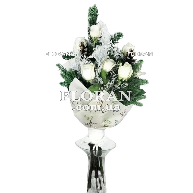 Невеликий зимовий букет - код товару FL-2217 - це ніжний та затишний твір природи, який приносить у будинок радість та тепло. У цьому невеликому букеті ми зібрали сім білих троянд, що символізують чистоту та світлість цієї пори року. Білі пелюстки троянд начебто прикрашені морозними візерунками, і вони наповнюють кімнату своїм умиротворюючим ароматом. Два шишки та гілки ялини чи сосни додають цьому букету нотку зимової казки. Шишки надають йому оригінальності та створюють атмосферу новорічного чарівництва, а гілки ялини чи сосни прикрашають букет натуральною зеленою прикрасою. Цей зимовий букет – чудовий подарунок, який подарує радість та затишок у холодні зимові дні. Він підходить для будь-якого випадку і дозволяє висловити ваші почуття та увагу. Подаруйте його близьким, друзям чи колегам – він стане незабутнім сюрпризом. Ми пропонуємо доставку нашими кур'єрами новорічних букетів у будь-яке місто України. Ми дбаємо про те, щоб ваш подарунок долетів вчасно та в надійних руках. Надійна упаковка та акуратна доставка – це наша гарантія якості. Нехай ваш подарунок приносить тепло та радість тим, хто його отримає!