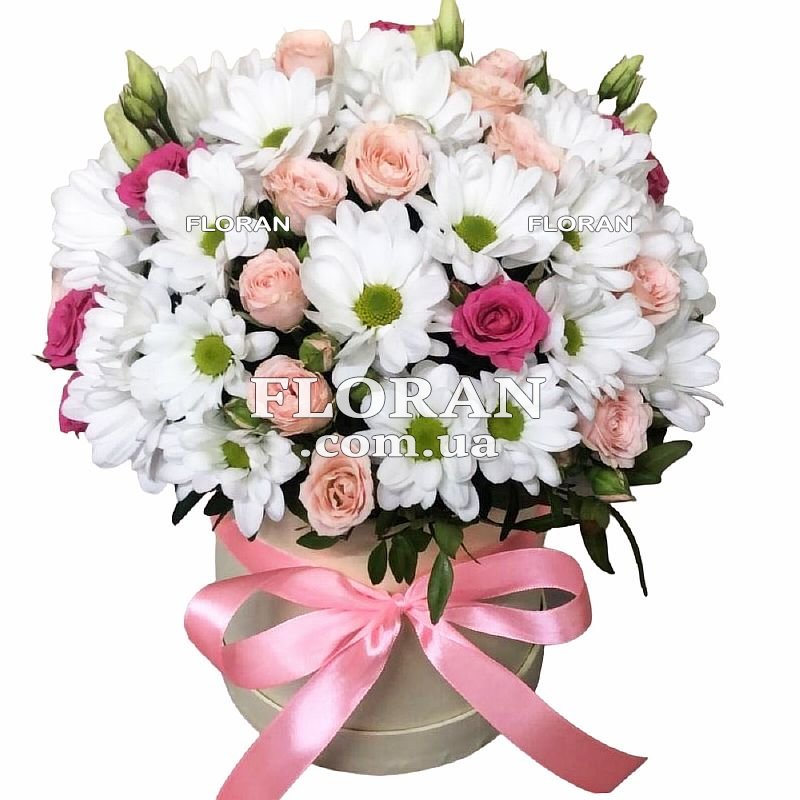 5 кремових та рожевих кущових троянд, 5 білих ромашкових хризантем, 3 еустоми, коробка