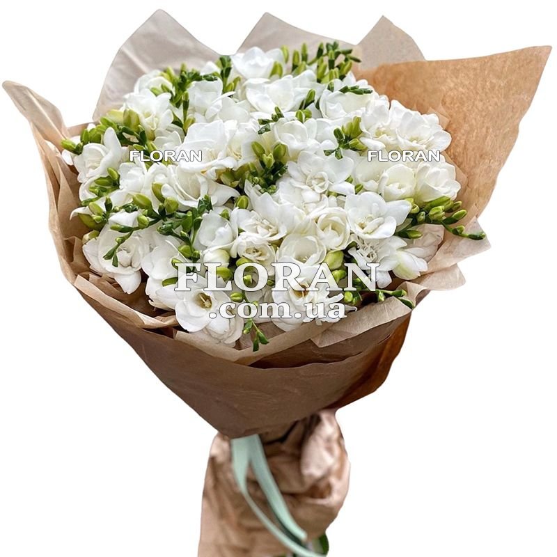Ніжний букет фрезій - код товару FL-1590 - це чудовий вибір, щоб висловити свою ніжність та захоплення вашій особливій дівчині. Білі фрезії символізують чистоту, невинність та ніжність, роблячи цей букет ідеальним для передачі своїх найщиріших та чуттєвих емоцій. Кожна біла фрезія випромінюватиме свій власний витончений та делікатний аромат, створюючи атмосферу спокою та прекрасного добробуту. Цей букет приноситиме умиротворення і радість вашої коханої, нагадуючи їй про вашу любов і турботу. Упаковка букета забезпечить його безпеку та чудову виставу. Ви можете вибрати упаковку відповідно до уподобань вашої дівчини - може бути це елегантна обгортка або стильна паперова упаковка, яка підкреслить красу фрезій. Ніжний букет з 33 білих фрезій буде ідеальним подарунком для особливих моментів, таких як дні народження, річниці, романтичні побачення або просто для того, щоб сказати я люблю тебе і показати свою ніжність. Цей букет стане символом вашої прихильності та турботи, говорячи про те, що ваша любов до неї непідробна і безмежна. Не забудьте додати до букету особисте послання, яке передасть ваше глибоке кохання та подяку. Ваші слова стануть цінним доповненням до цього ніжного букета, роблячи його ще більш значущим та особливим. Подаруйте вашій коханій ніжний букет з 33 білих фрезій, щоб вона відчула всю красу вашого кохання та турботи. Цей букет стане неперевершеним символом вашого романтичного та глибокого зв'язку, наповнюючи її серце радістю та щастям.