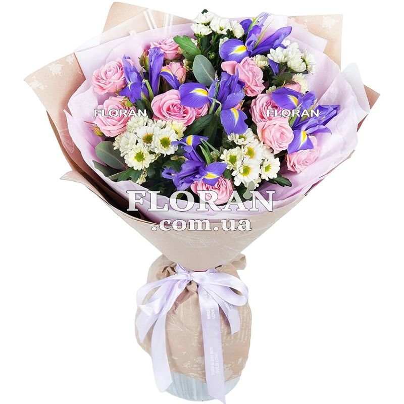 Ніжний букет квітів з ірисами - код товару FL-2519 - це чудовий подарунок, який підходить для новосілля або для привітання з випискою з пологового будинку. Цей букет принесе свіжість та радість у нове житло або у спеціальний момент народження дитини. Рожеві кущові троянди символізують ніжність та доброту. Вони приносять у подарунок тепло та ласку, що робить їх ідеальним вибором для поздоровлень із новосіллям. Білі хризантеми додають букету світлу та чисту енергію. Вони створюють атмосферу чистоти та свіжості, і їхній білий колір символізує новий початок. Іриси символізують повагу та привітання. Їхня ніжність і краса роблять букет ще більш особливим. Упаковка для букета допомагає зберегти його свіжість та надати подарунку завершеного вигляду. Це додає додаткової елегантності та оформляє ваш подарунок якнайкраще. Такий букет ідеально підходить для поздоровлення з новосіллям, щоб прикрасити новий будинок свіжими квітами та дарувати тепло. Він також може бути чудовим подарунком для молодих батьків, які щойно стали щасливими батьками та чекають на дитину. Наш магазин гарантує надійну доставку букета в потрібний час та місце. Ми дбаємо про те, щоб ваш подарунок досяг отримувача у найкращому стані, приносячи радість та посмішку.