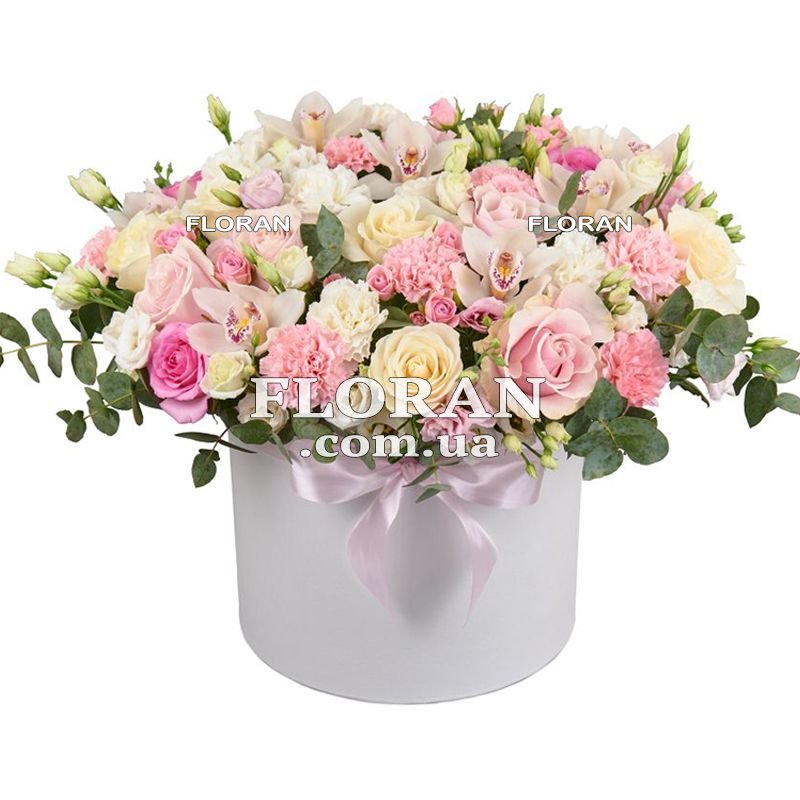 7 білих орхідей, 16 білих та рожевих гвоздик, 20 білих та рожевих троянд, 4 рожеві кущові троянди, 10 білих еустом, зелень, коробка