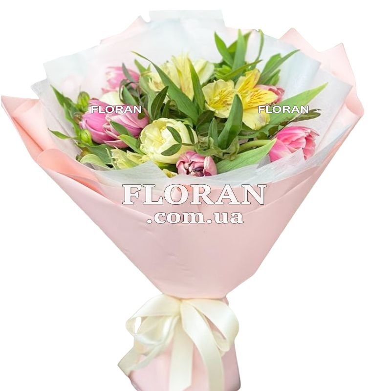 Ніжний весняний букетик - код товару FL-2453 - це справжній символ весни та надії, ідеальний подарунок для дівчинки, мами чи коханої жінки. Цей букет несе в собі всю ніжність і тепло весняних днів, що робить його придатним для багатьох чудових моментів, включаючи привітання з 8 Березня або просто бажання зробити близькій людині приємний сюрприз. Сім рожевих тюльпанів – це символ ніжності та романтики. Рожевий колір асоціюється з любов'ю та ніжністю, і цей букет дозволить висловити ваші теплі почуття до отримувача. Чотири жовті альстромерії додають яскравого акценту до букету. Жовтий колір уособлює щастя, радість та світле майбутнє, і він чудово доповнює ніжність рожевих тюльпанів. Цей букет буде уособленням вашої уваги та турботи. Він не тільки привнесе краплю весни в сірі будні, а й подарує незабутні моменти радості та умиротворення. Не забувайте, що доставка нашими кур'єрами можлива у будь-яке місце, що дозволяє зробити цей ніжний букет доступним та зручним подарунком для вас та ваших близьких. Весь цей ніжний букет пронизаний весняним настроєм і готовий приносити радість своєму власнику.
