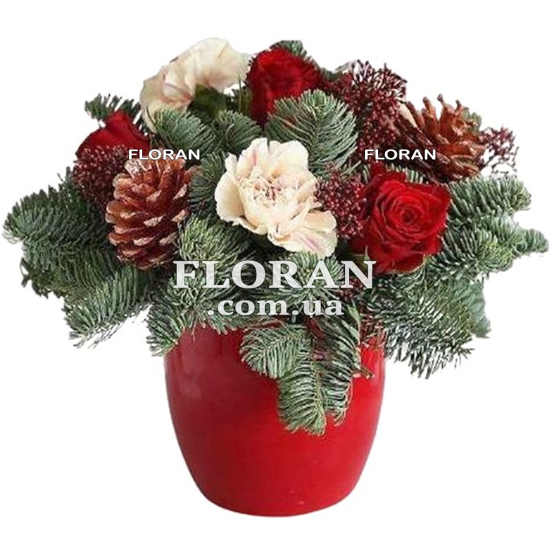 Новорічна композиція у кашпо – код товару FL-2169 – це невеликий, але чарівний подарунок, який може додати святковий настрій у будинок чи офіс. Складена з 3 червоних троянд, 2 гвоздики, 2 шишок і прикрашена гілками ялинки або сосни, вона є чудовим символом Нового року та Різдва. Червоні троянди, як символ пристрасті та любові, надають цій композиції особливого шарму та ніжності. Гвоздики та шишки додають текстуру та інтерес до аранжування. Гілки ялинки або сосни надають композиції святкового характеру, нагадуючи про новорічні ялинки та атмосферу свята. Кашпо, в якому представлена ця композиція, робить її легкою у догляді та підтримує свіжість квітів. Такий подарунок може бути ідеальним доповненням до святкового столу або гарною декорацією в інтер'єрі напередодні свят. Будьте впевнені, що така композиція радуватиме вас чи ваших близьких своєю красою та святковим настроєм у цей чарівний сезон.