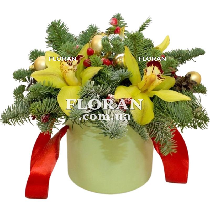 3 орхідеї, 5 ялинкових куль, гілки ялини або сосни, коробка