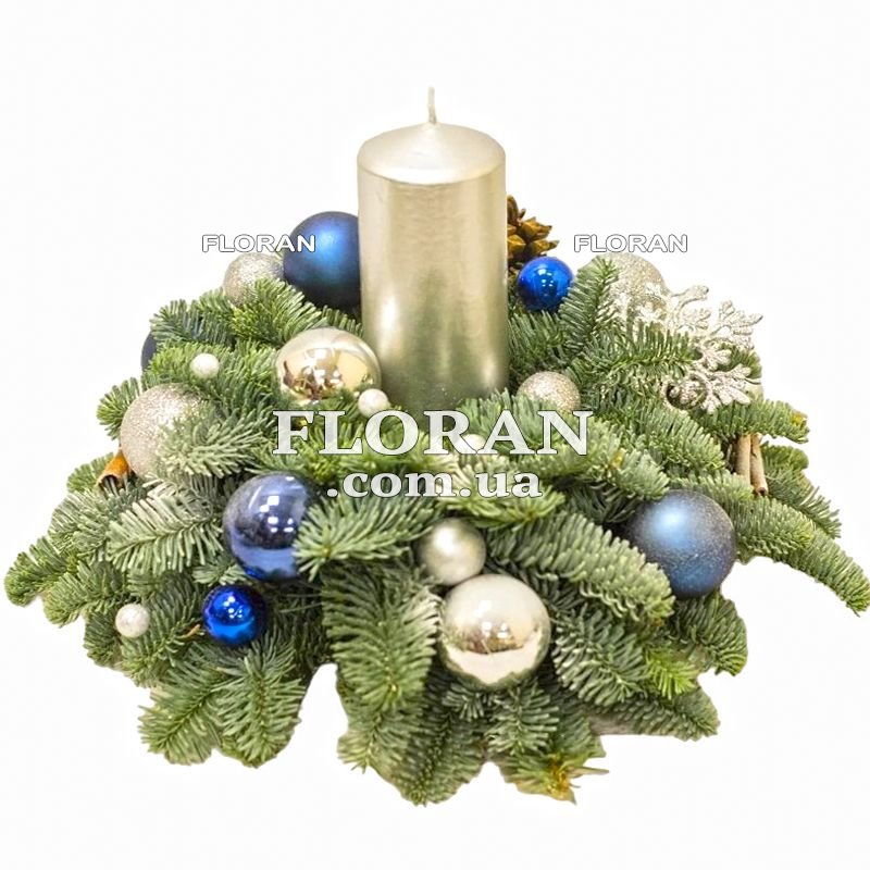 Новорічна композиція з ялинових гілок – код товару FL-597. Новорічна композиція з ялинових гілок круглої форми зі свічкою посередині – це чудовий декоративний елемент, який може прикрасити будь-яке новорічне свято. Ця композиція виглядатиме дуже ефектно на столі під час святкової вечері чи вікна, створюючи затишну атмосферу.