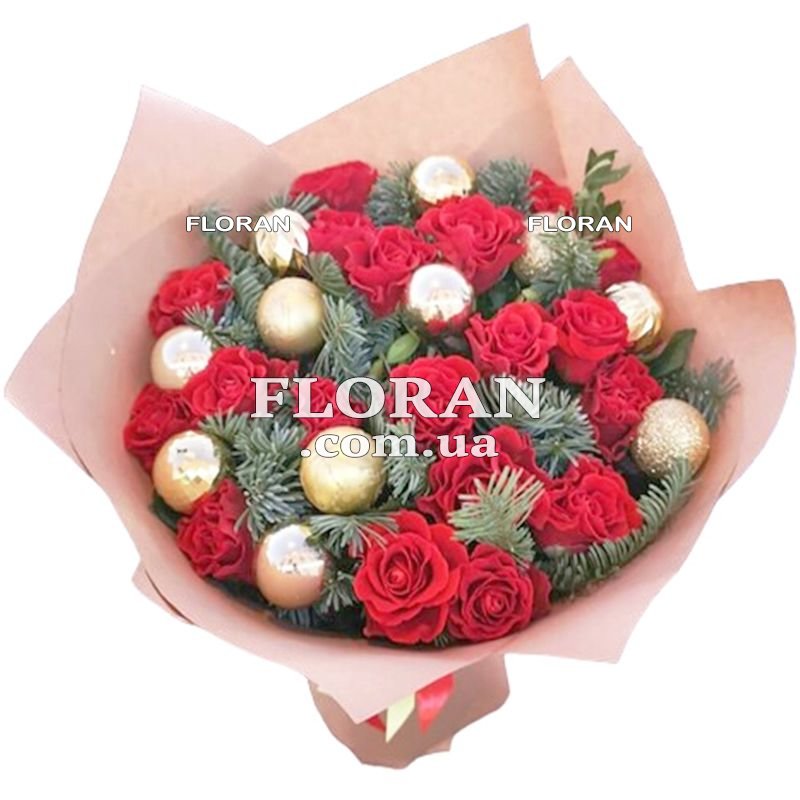 Новорічний букет квітів - код товару FL-615. Цей новорічний букет з 19 червоних троянд та золотистих кульок є чудовим подарунком для тих, хто цінує елегантність та вишуканість. Червоні троянди символізують любов, пристрасть та сильні почуття, а золотисті кулі додають до цього нотки свята та радості. Букет може стати яскравою окрасою новорічного столу, а також подарунком для близьких та друзів.