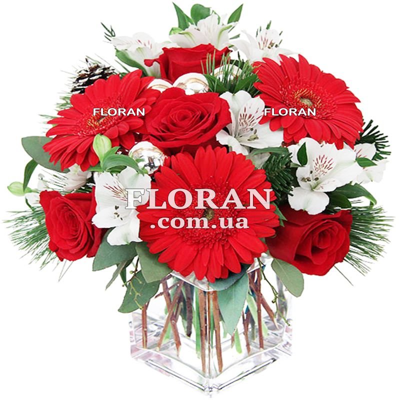 3 червоні гербери, 4 червоні троянди, 4 білі альстромерії, 6 ялинкових куль, зелень, упаковка
