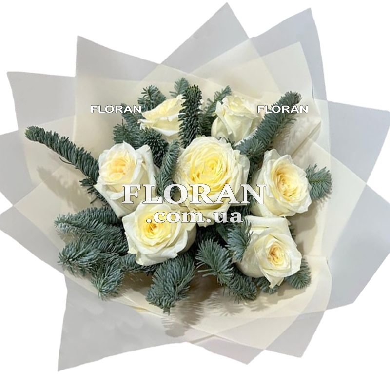 Новорічний букет з білих троянд - код товару FL-2242 - це чудовий вияв ніжності та чистоти, який стане чудовим подарунком на свято. Ці 9 білих троянд символізують чистоту та свіжість нового початку, а гілки ялини чи сосни додають природної атмосфери та святкового настрою. Цей букет підійде як для жінки, так і для чоловіка, адже білі троянди – це універсальний символ захоплення та поваги. Він підкреслить вашу увагу та турботу, а також буде радісним та красивим доповненням до новорічного столу чи інтер'єру. Упаковка завершує вигляд цієї неймовірної композиції, роблячи її готовою до вручення. Ви можете вибрати ту упаковку, яка найкраще підходить до вашого стилю та настрою свята. Наші кур'єри готові забезпечити доставку букету до будь-якого міста України, щоб ваш подарунок прийшов вчасно та в ідеальному стані. Нехай цей букет стане вашим засобом висловити теплі побажання та створити атмосферу свята у будинку вашої близької людини.
