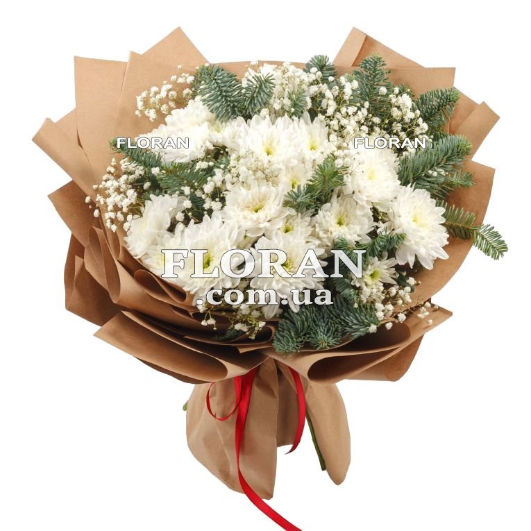 5 білих кущових хризантем, гіпсофіла, гілки ялинки або сосни, упаковка