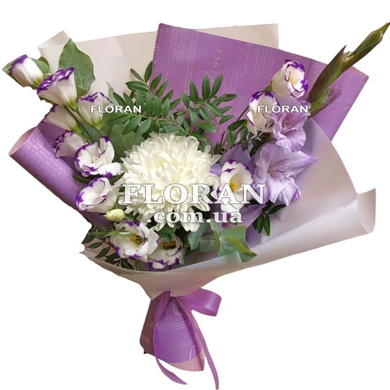 1 хризантема, 1 гладіолус, 3 еустоми, зелень, упаковка