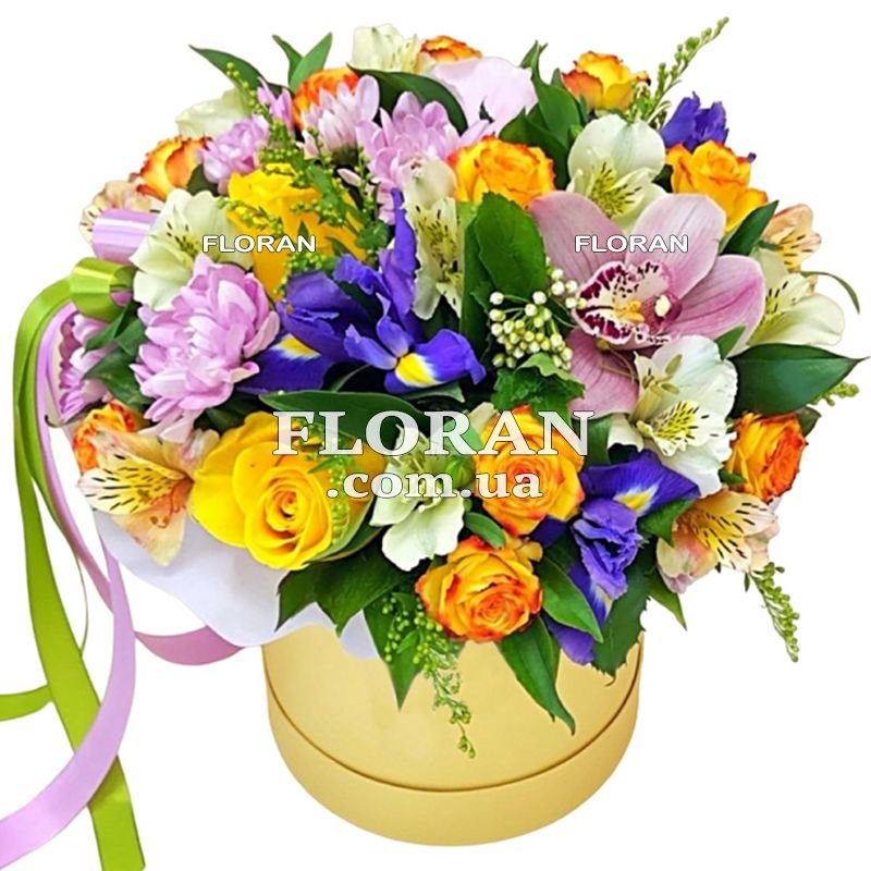 2 рожеві орхідеї, 3 іриси, 3 жовті троянди, 3 жовті/помаранчеві кущові троянди, 3 альстромерії, 3 рожеві хризантеми, коробка