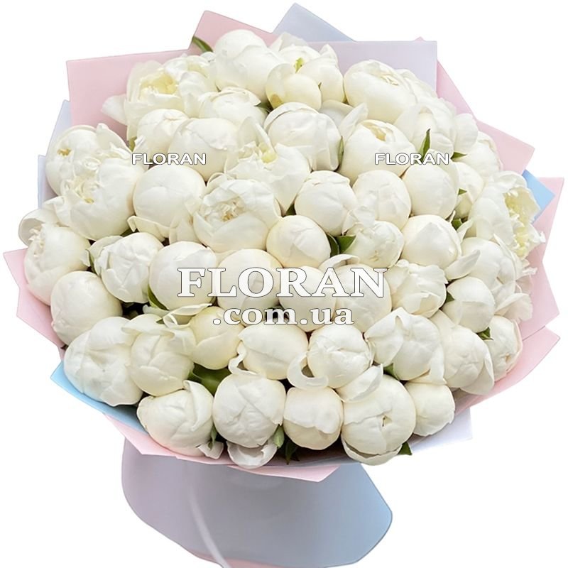 Півонії 51 штука - код товару FL-3013 - це втілення витонченої елегантності та розкоші. Кожна дівчина і мама мріє про такий чудовий подарунок, який здатний висловити найщиріші почуття і глибоку вдячність. Білі півонії символізують чистоту, невинність і гармонію, створюючи вражаючий образ ніжності та благородства. Кожна півонія в цьому букеті має великі, пишні бутони і вишуканий аромат, що наповнює простір неповторною чарівністю. Упаковка, ретельно підібрана для цього букета, не тільки зберігає свіжість квітів, а й підкреслює їхню природну красу, створюючи ідеальний презент для найбільш значущих моментів. Цей букет з 51 білої півонії стане незабутнім подарунком для особливих випадків, таких як ювілеї, весілля, дні народження або просто як знак глибокої любові і поваги. Даруючи такий букет, ви не просто підносите квіти, а висловлюєте свої найщиріші та тепліші почуття, створюючи атмосферу радості та захоплення. Подаруйте своїм близьким цей чудовий букет, щоб вони відчули вашу турботу та увагу.