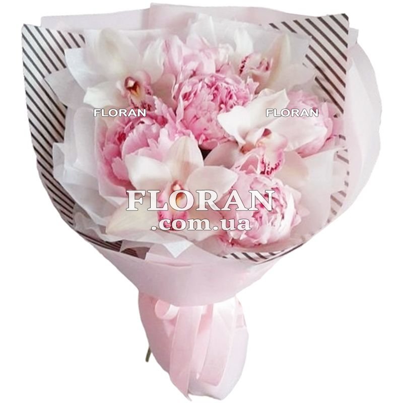 Півонії орхідеї – код товару FL-1630 – це вишукане поєднання двох прекрасних кольорів, які створюють неповторну атмосферу романтики та ніжності. У цьому букеті міститься 5 півонії та 4 білі орхідеї, які разом утворюють гармонійну композицію. Півонії, з їх пишними та ароматними суцвіттями, символізують любов, красу та благополуччя. Вони є одними з найромантичніших кольорів і завжди привертають увагу своєю ніжністю та витонченістю. Білі орхідеї, у свою чергу, додають букету елегантності та вишуканості, надають йому особливого шарму та виразності. Такий букет з півонії та білих орхідей є чудовим подарунком на особливі випадки, такі як день народження, ювілей, весілля чи романтичне побачення. Він дозволить висловити свої глибокі почуття та подарувати незабутні емоції. Букет радуватиме своєю красою та свіжістю, наповнюючи простір ароматом та повітрям чарівництва. Кожен букет з орхідей та півонії, оформлений нашим магазином, створюється з любов'ю та професіоналізмом. Ми пропонуємо доставку наших квіткових композицій з орхідей та півонів у будь-яке місто України, щоб кожна людина могла випробувати радість та захоплення від такого чудового подарунка. Наша служба доставки гарантує збереження та свіжість кольорів, щоб вони досягли адресата у найкращому стані та принесли масу позитивних емоцій.