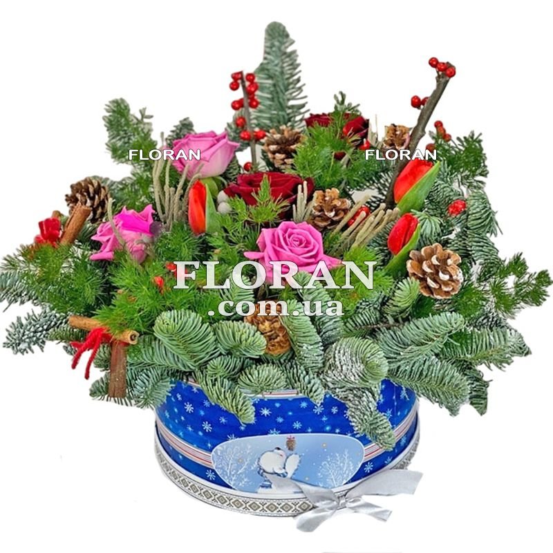 5 червоних та рожевих троянд, 4 червоні тюльпани, зелень, гілки ялини або сосни, коробка