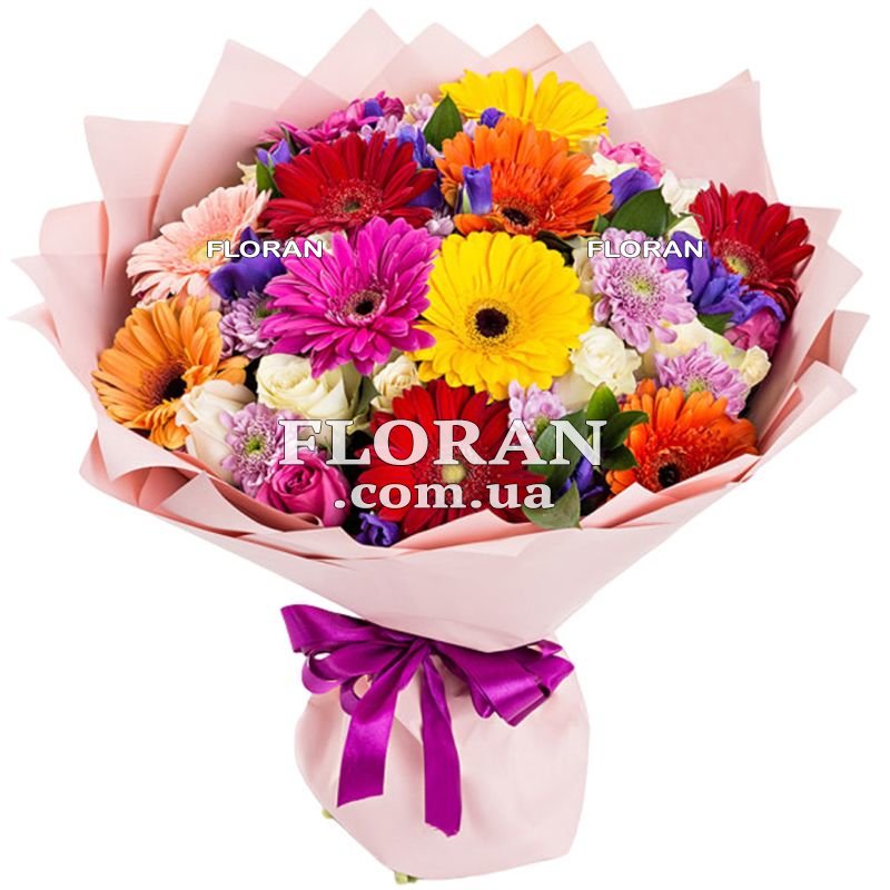 Пишний букет - код товару FL-256. Цей букет складається з 11 різнокольорових гербер, 25 білих і рожевих троянд, 10 ірисів і 5 рожевих хризантем. Різнобарвний пишний букет - це справжня казка з квітів. Він вражає своєю красою і розмаїттям відтінків, переносить вас у світ яскравих фарб і ароматів. Він підійде для будь-якого випадку - від романтичного побачення до ювілею. Такий букет можна подарувати коханій людині, батькам, друзям або колегам. Він стане справжнім символом вашої любові, вдячності або поваги.