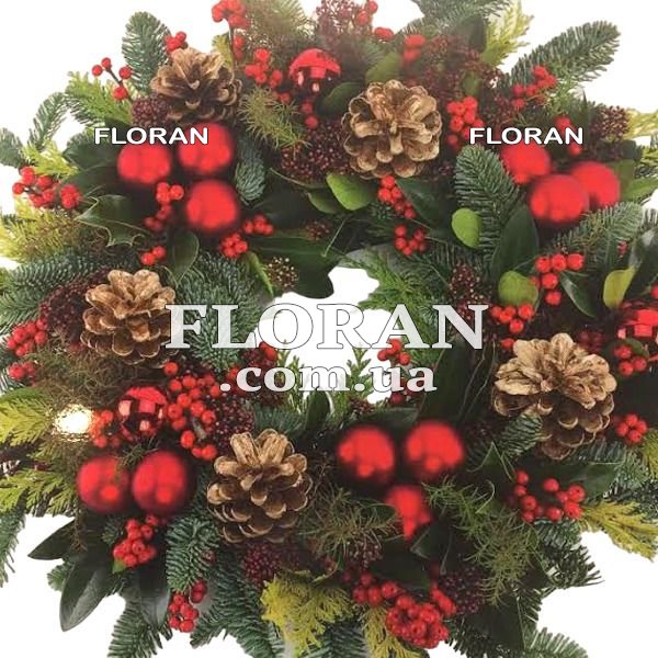 Різдвяний вінок - код товару FL-2196 - прикрашений 12 червоними ялинковими кулями, 5 шишками, зеленню та гілками ялинки або сосни, створений, щоб надати вашій оселі святкової атмосфери і внести в неї дух Різдва. Червоні ялинкові кулі - це символ Різдва та святкової радості. Вони надають вінку яскравого і радісного вигляду, а також нагадують про те, що настає час чарівництва та сімейних традицій. Шишки та зелень додають натуральності та природної краси у ваш будинок. Вони також можуть асоціюватися із засніженим лісом та таємничістю Різдва. Гілки ялини або сосни надають вінку текстуру та об'єм, роблячи його більш об'ємним та святковим. Цей різдвяний вінок можна розмістити на дверях, стінах або столах, щоб створити затишну і радісну атмосферу у вашому будинку під час свята. Він також може стати чудовим подарунком для близьких і друзів, щоб поділитися святковим настроєм і радістю Різдва.