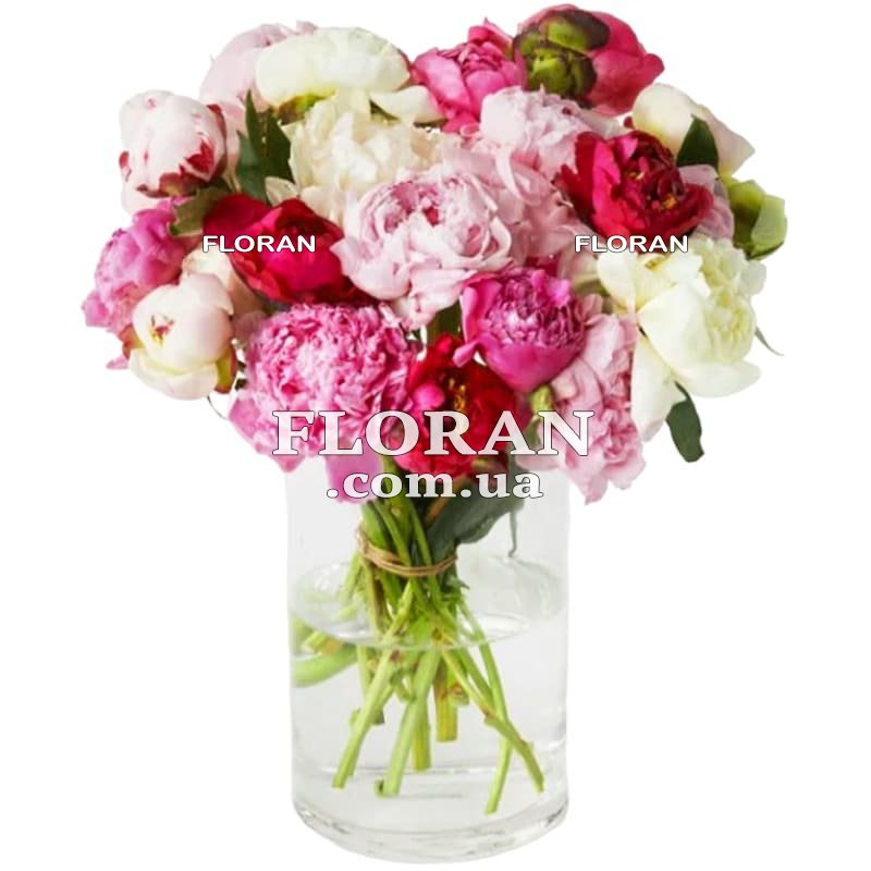 Різнокольорові півонії - код товару FL-947. Букет з двадцяти трьох різнокольорових півоній - це справжня симфонія квітів та ароматів. Кожен із цих півонів яскравий, неповторний і привабливий, наче маленький витвір мистецтва. Різнокольорові півонії в букеті приносять радість та веселощі. Вони переплітаються разом, створюючи дивовижну гармонію кольорів та відтінків. Кожна півонія має свою індивідуальність, від яскравих червоних до ніжних рожевих, від сліпучих білих до прекрасних фіолетових.