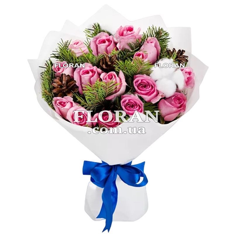 Рожеві троянди у зимовому букеті - код товару FL-2255. Новорічний букет квітів у Києві – це дивовижний подарунок, який допоможе вам висловити свої найкращі побажання та почуття близьким під час Різдвяних свят! Адже немає нічого більш чарівного та таємничого, ніж атмосфера Різдва. І як краще підкреслити цю магію, ніж подарувати барвистий і ароматний букет? Наші флористи уважно підходять до створення кожного букета, щоб він відбивав все диво цієї пори року. Вони використовують 15 ніжних рожевих троянд, 3 шишки, а також гілки ялини чи сосни, щоб створити унікальний новорічний букет. А де можна замовити зимові букети у Києві за доступними цінами? Звісно ж, в інтернет-магазині Floran.com.ua! Ми маємо найвигідніші пропозиції на новорічні букети, а також інші красиві композиції, які флористи оформляють у новорічному стилі. Наші ціни доступні, а якість букетів завжди на висоті. Як зробити замовлення на зимові букети у Києві? Це дуже просто! Просто залиште заявку на нашому сайті і наш менеджер зв'яжеться з вами для уточнення всіх деталей замовлення. Ми працюємо для вас, щоб зробити процес замовлення максимально зручним та приємним. І найприємніший момент: доставка квітів у Києві та в будь-яке інше місто України виконується точно в рядки! На сайті ви можете замовити цей або інші зимові букети та бути впевненими, що вони будуть доставлені точно та вчасно. Подаруйте магію Різдва з нашими барвистими букетами!