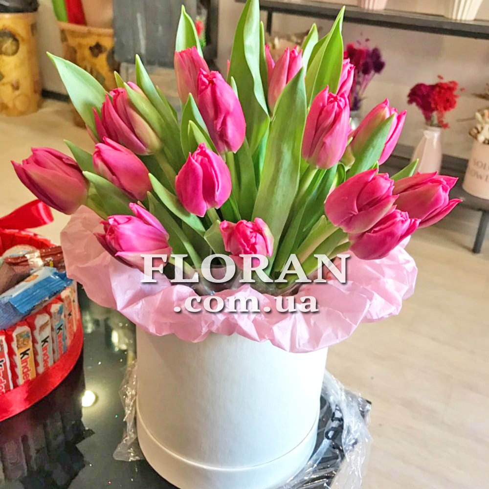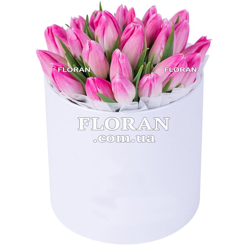Рожеві тюльпани в капелюшній коробці - код товару FL-244. Рожеві тюльпани - це символ ніжності, любові та краси. Коли ви хочете зробити ніжний, але водночас яскравий подарунок, рожеві тюльпани в капелюшній коробці стануть ідеальним вибором. Ми пропонуємо букет з 25 рожевих тюльпанів, акуратно покладених у капелюшну коробку і прикрашених відповідним кольором стрічками. Цей букет ідеально підійде для багатьох випадків, чи то день народження, річниця весілля, чи то просто раптовий подарунок для вашої коханої. Ви можете замовити рожеві тюльпани в капелюшній коробці прямо з нашого сайту і отримати доставку у зручний для вас час і місце. Не пропустіть можливість порадувати своїх близьких і близьких вам людей за допомогою наших красивих і якісних квіткових букетів.