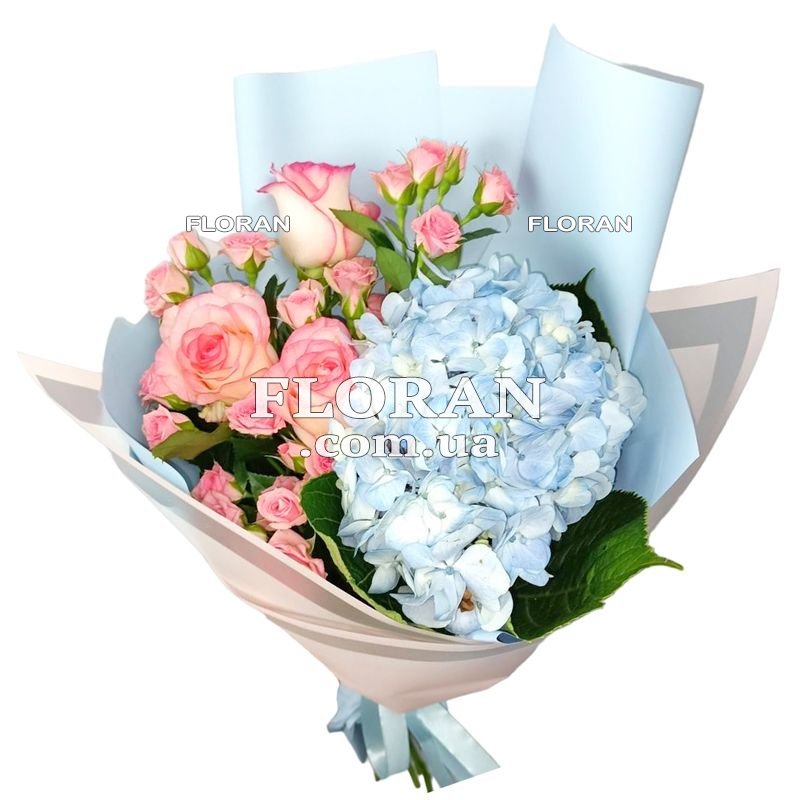 Рожевий блакитний букет - код товару FL-1087. Цей рожево-блакитний букет буде прекрасним поєднанням квітів. Він включає 1 блакитну гортензію, 3 рожеві троянди і 5 рожевих кущових троянд, а також упаковку. Блакитна гортензія буде центральним акцентом букета. Ця квітка символізує ніжність, мир і гармонію. Блакитна гортензія також може висловлювати подяку і побажання успіху. Рожеві троянди додадуть романтичності та жіночності в букет. Рожевий колір троянд асоціюється з любов'ю, красою та елегантністю. Вони можуть бути символом ніжних почуттів і романтичних стосунків. Рожеві кущові троянди доповнять букет своїми безліччю ніжних квіток. Вони надають букету об'єм і текстуру, створюючи враження повноти і витонченості. Упаковка завершить образ букета. Цей рожево- блакитний букет буде ідеальним подарунком для особливих випадків, таких як День Народження, Ювілей або Свято Любові. Він висловлює ніжність і романтику, приносячи радість і захоплення.