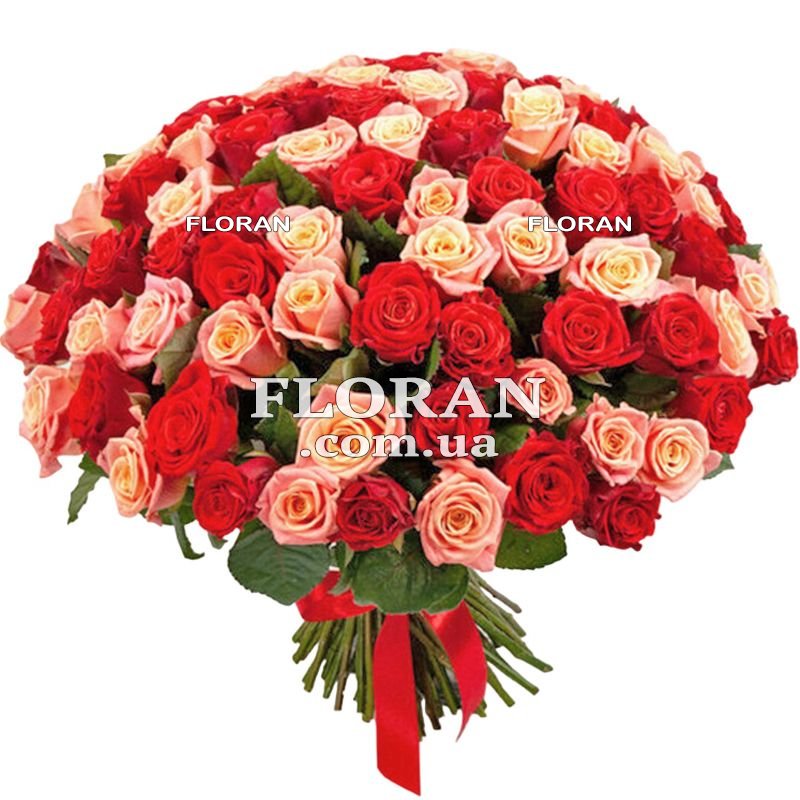 Розкішна 101 троянда - код товару FL-1470. Цей букет буде вражаючим та елегантним подарунком, здатним викликати захоплення та подив. Червоні троянди давно вважаються класичним символом мови квітів, що виражає полум'яну пристрасть, шалене бажання, глибоку душевну близькість, вірність та відданість. Коли червоний колір троянд чергується з іншими відтінками, це робить букет ще більш ефектним і незабутнім. Троянда міс піггі, з м'яким персиковим відтінком та ніжними пелюстками, додає унікальності та оригінальності до букету. Вона символізує дружбу, подяку та ніжність. Троянда міс піггі створює контраст з червоною трояндою і додає особливого шарму та вишуканості букету. Кожна зі 101 троянд буде відібрана з особливою увагою, щоб гарантувати свіжість та красу кожного бутону. Букет буде оформлений професійними флористами, щоб створити елегантну та гармонійну композицію. Розкішний букет з 101 червоної троянди та троянди міс піггі буде ідеальним подарунком для особливих випадків, таких як день народження, річниця, весілля чи будь-який інший значущий момент. Він також може бути чудовим проявом уваги та турботи до вашої коханої чи близької людини. Не забудьте про можливість доставки. Ми можемо організувати доставку цього розкішного букета зі 101 троянди прямо за вказаною адресою, щоб здивувати та порадувати отримувача. Зробіть замовлення прямо зараз, щоб створити незабутню романтичну атмосферу для вашої коханої за допомогою розкішної 101 троянди.