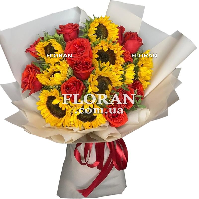Соняшники та троянди - код товару FL-1513 - це розкішне поєднання яскравості та ніжності. У цьому букеті ви знайдете дев'ять чудових соняшників, які додадуть сонячного настрою та уособлять оптимізм. Крім того, у композиції присутні 14 червоних троянд, що символізують пристрасть та кохання. Соняшники своїм яскравим жовтим забарвленням привертають погляди і наповнюють простір теплом та радістю. Троянди ж, своєю витонченістю та елегантністю, надають букету романтичного шарму і створюють гармонійне поєднання з соняшниками. Цей букет з соняшниками та трояндами буде чудовим вибором для особливих моментів у житті, таких як день народження, ювілей, річниця або просто для того, щоб висловити свої почуття та турботу коханій людині. Він захопить і надихне отримувача своєю красою та символічним значенням кольорів. У нашому магазині ви можете замовити цей букет із соняшниками та трояндами. Кожна троянда та соняшник підібрані із турботою, щоб створити гармонійний та вражаючий образ. Доставка букета здійснюється з турботою про квіти, щоб вони залишилися свіжими та красивими протягом довгого часу. Букет буде доставлений точно у вказану дату, щоб створити максимальний ефект та подарувати незабутні моменти радості та щастя. Вибираючи цей букет із соняшниками та трояндами, ви створите особливу атмосферу та подаруєте одержувачу незабутні емоції. Цей чудовий склад яскравих і ніжних квітів уособлює любов, щастя і благополуччя.