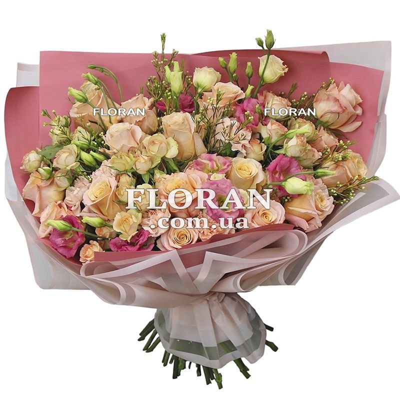 Сучасний букет квітів троянд і еустом - це стильний і оригінальний вибір для тих, хто хоче порадувати своїх близьких незвичайним презентом. Комбінація великих і ніжних квіток троянд у поєднанні з витонченими гілочками еустом створює яскравий і незвичайний букет, який точно сподобається любителям оригінальних композицій. Букет з троянд і еустом може стати прекрасним подарунком на день народження, ювілей або інше свято. До того ж, цей букет підійде як для жінок, так і для чоловіків. Він буде чудово виглядати в будь-якому інтер'єрі, додаючи яскравих фарб і створюючи атмосферу затишку і радості.