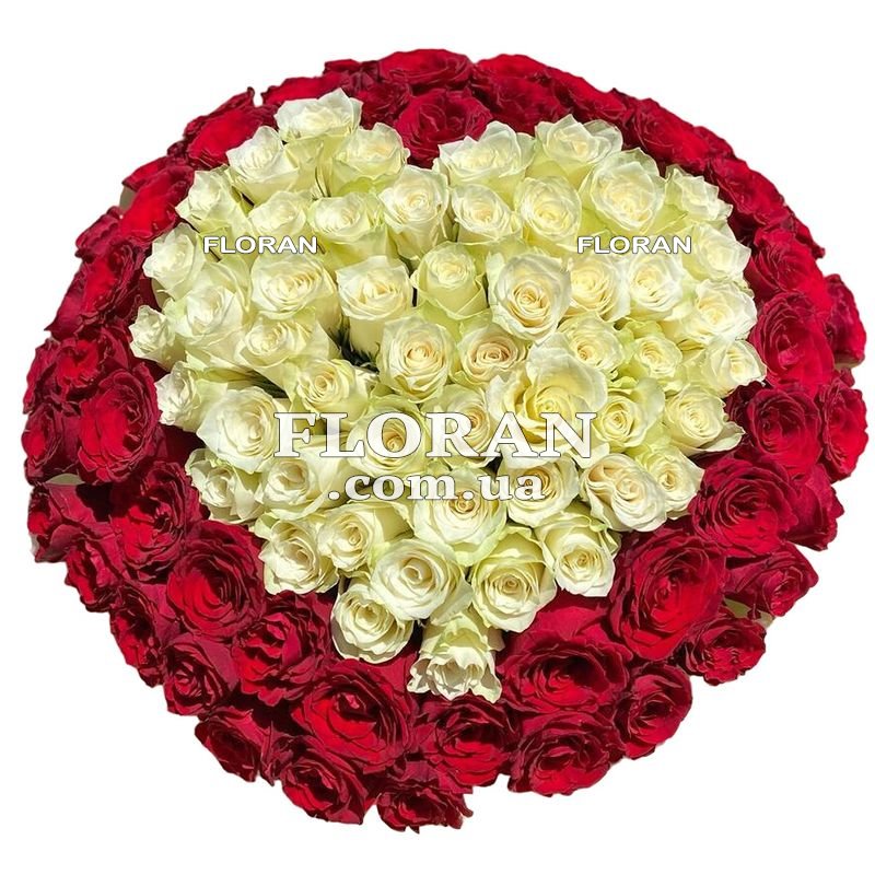 Троянди для коханої - код товару FL-125. Величезний букет зі 101 червоної та білої імпортних троянд - це те, що потрібно для того, щоб висловити свої почуття до коханої людини. Букет імпортних троянд - це завжди висока якість і свіжість квітів. VIP букет з червоних і білих троянд - це справжній шедевр флористики, який вразить своєю красою і вишуканістю. Червоного і білого кольору троянди символізують любов і чистоту, що робить цей букет ідеальним подарунком для коханої жінки. Подаруйте їй цей букет і ви побачите, як її очі засяють від щастя.