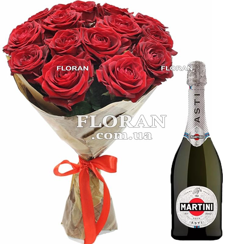 Троянди і шампанське - код товару FL-27. Хочете порадувати свою другу половинку? Подаруйте їй букет із троянд і пляшку шампанського Asti Martini 0,75 л. У нашому магазині ви можете замовити букет з українських троянд червоного кольору. У комплекті з букетом йде пляшка шампанського Asti Martini 0,75 л. У букеті 15 червоних троянд, які символізують любов і пристрасть. Шампанське Asti Martini - це ідеальне доповнення до романтичного вечора. Воно має легкий фруктовий смак і аромат, який підкреслить романтичну атмосферу.