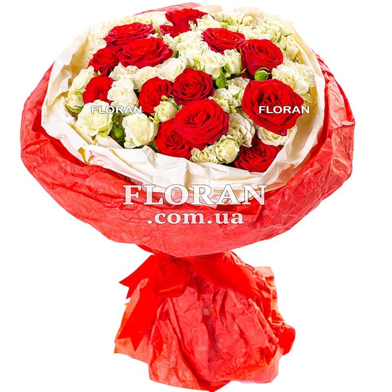 Троянди кущові білі червоні - код товару FL-105. Букет із червоних і білих кущових троянд вражає своїм контрастом, створюючи яскраві та насичені враження. Червоні троянди символізують пристрасть і кохання, а білі - чистоту і невинність, разом вони створюють ідеальний баланс між емоціями і почуттями. Цей букет не тільки має чудовий вигляд, а й викликає яскраві емоції, роблячи його ідеальним подарунком для будь-якого випадку. У ньому зібрано 21 червона і біла кущова троянда, які створюють неповторну атмосферу свята. Букет гіллястих кущових троянд, де білий колір поєднується з яскраво-червоним, має дуже ефектний і елегантний вигляд, створюючи цікавий контраст і уособлюючи сильні почуття.