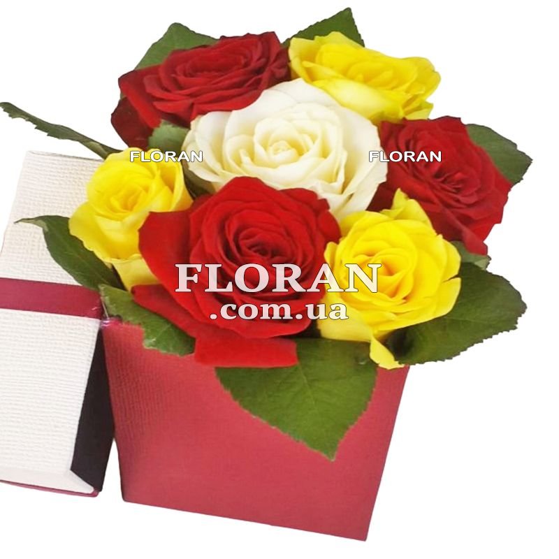 Троянди у квадратній коробці - код товару FL-184. Маленький, але чарівний подарунок - композиція з різнокольорових троянд у квадратній коробці. Такий ніжний букетик стане прекрасним доповненням до будь-якого свята або даром просто так, щоб підняти настрій близькій людині. До складу композиції можуть входити троянди різних відтінків - від яскравих червоних до ніжних рожевих і лавандових. Коробка, в якій представлені квіти, виконана в строгому квадратному стилі, що надає композиції особливого шарму і вишуканості. Такий подарунок легко вміститься на столі або поличці та тішитиме око своєю красою і ніжністю довгий час.